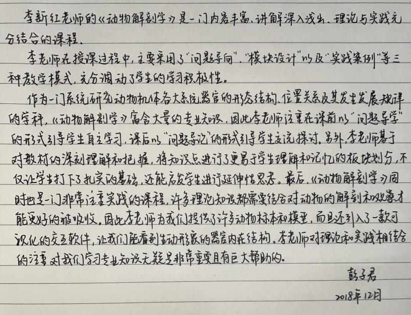 李新红老师的《动物解剖学》是一门内容丰富、讲解深入浅出、理论与实践充分结合的课程。李老师在授课过程中,主要采用了“问题导向”、“模块设计”以及“实践案例”等三种教学模式,充分调动了学生的学习积极性。为一门系统研究动物机体各大系统器官的形态结构、位置关系及其发生发展规律的学科,《动物解剖学》富含大量的专业知识,因此李老师注重在课前以“问题导学”的形式引导学生自主学习,课后以“问题导论”的形式引导学生交流探讨。另外,李老师基于对教材的深刻理解和把握,将知识点进行了更易于学生理解和记忆的板块划分,不仅让学生打下扎实的基础,还能启发学生进行延伸性思考。最后《动物解剖学》同时也是一门非常注重实践的课程,许多理论知识都需要结合对动物的解剖和观察才能更好的被吸收。因此李老师为我们提供了许多动物标本和模型,而且还引入了一款可视化的交互软件,让我们能看到生动形象的器官内在结构。李老师对理论和实践相结合的注重,对我们专业知识学习无疑是非常重要且有巨大帮助。